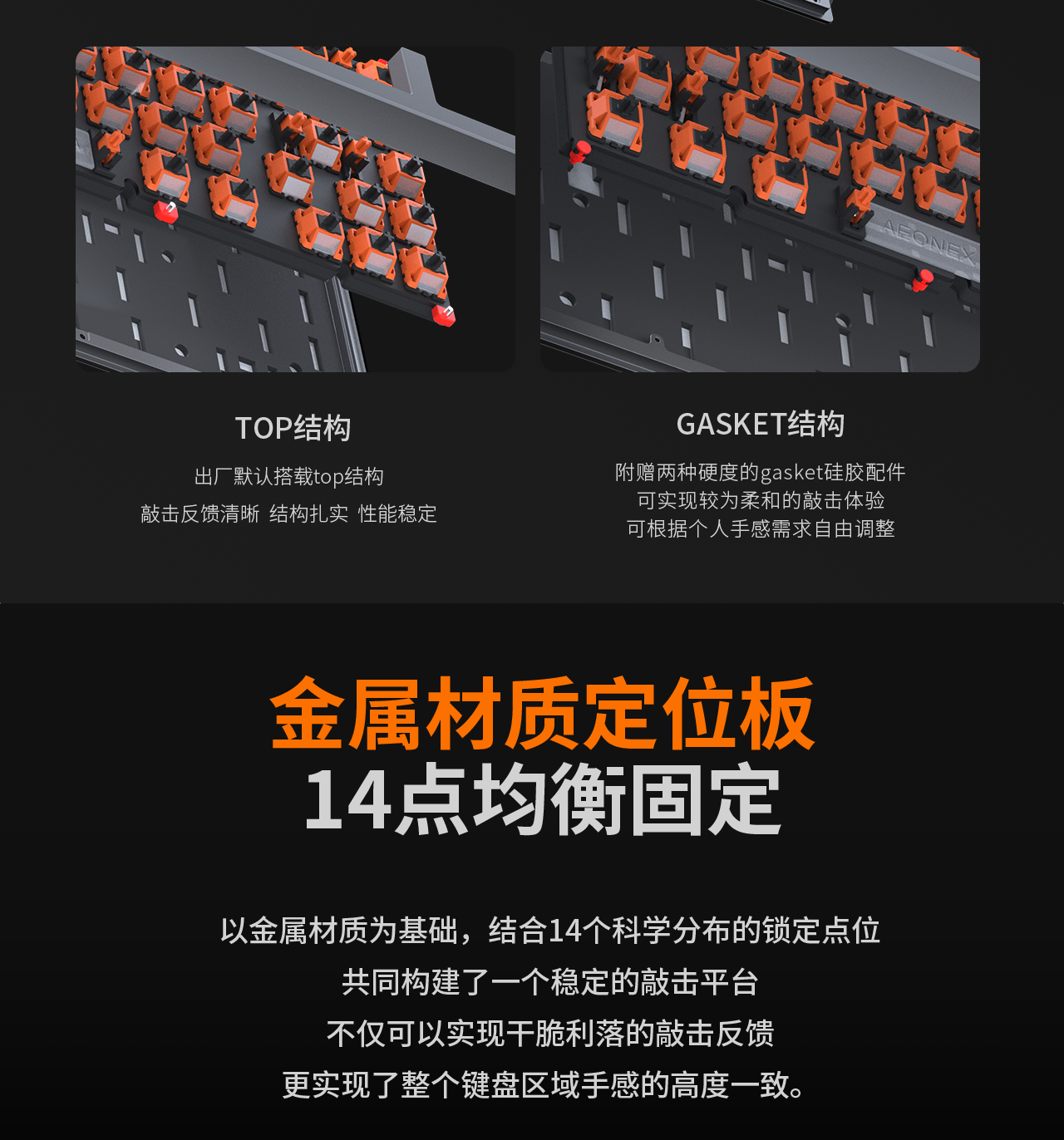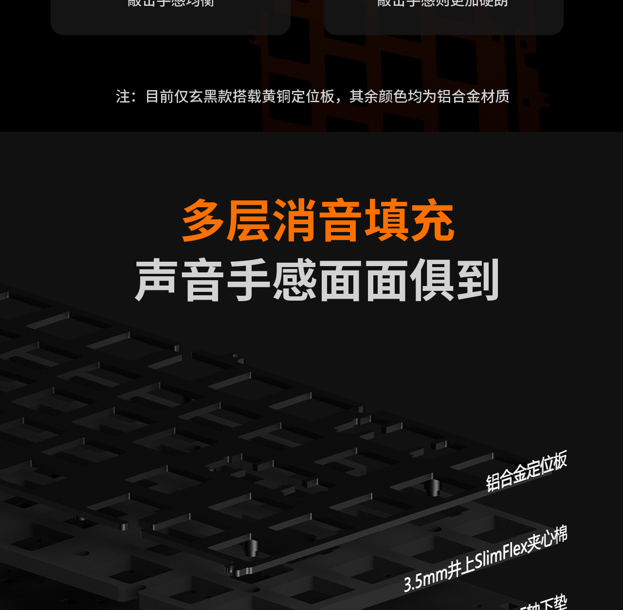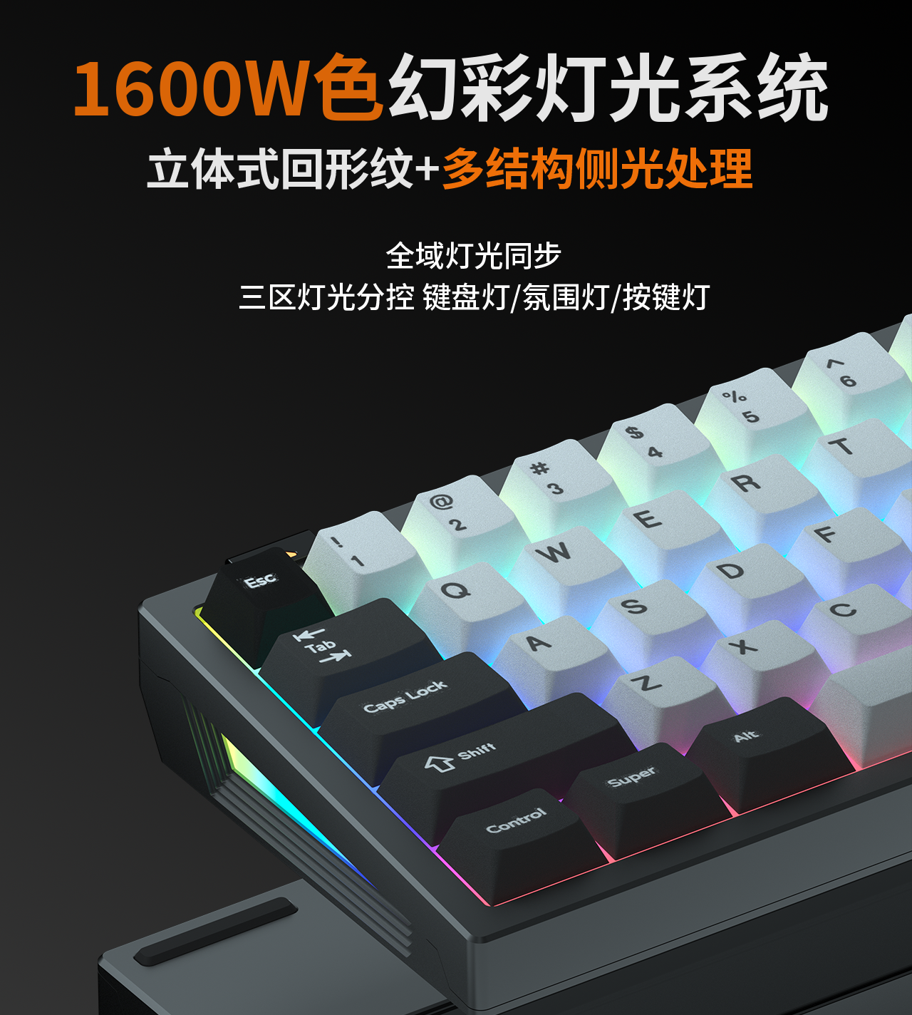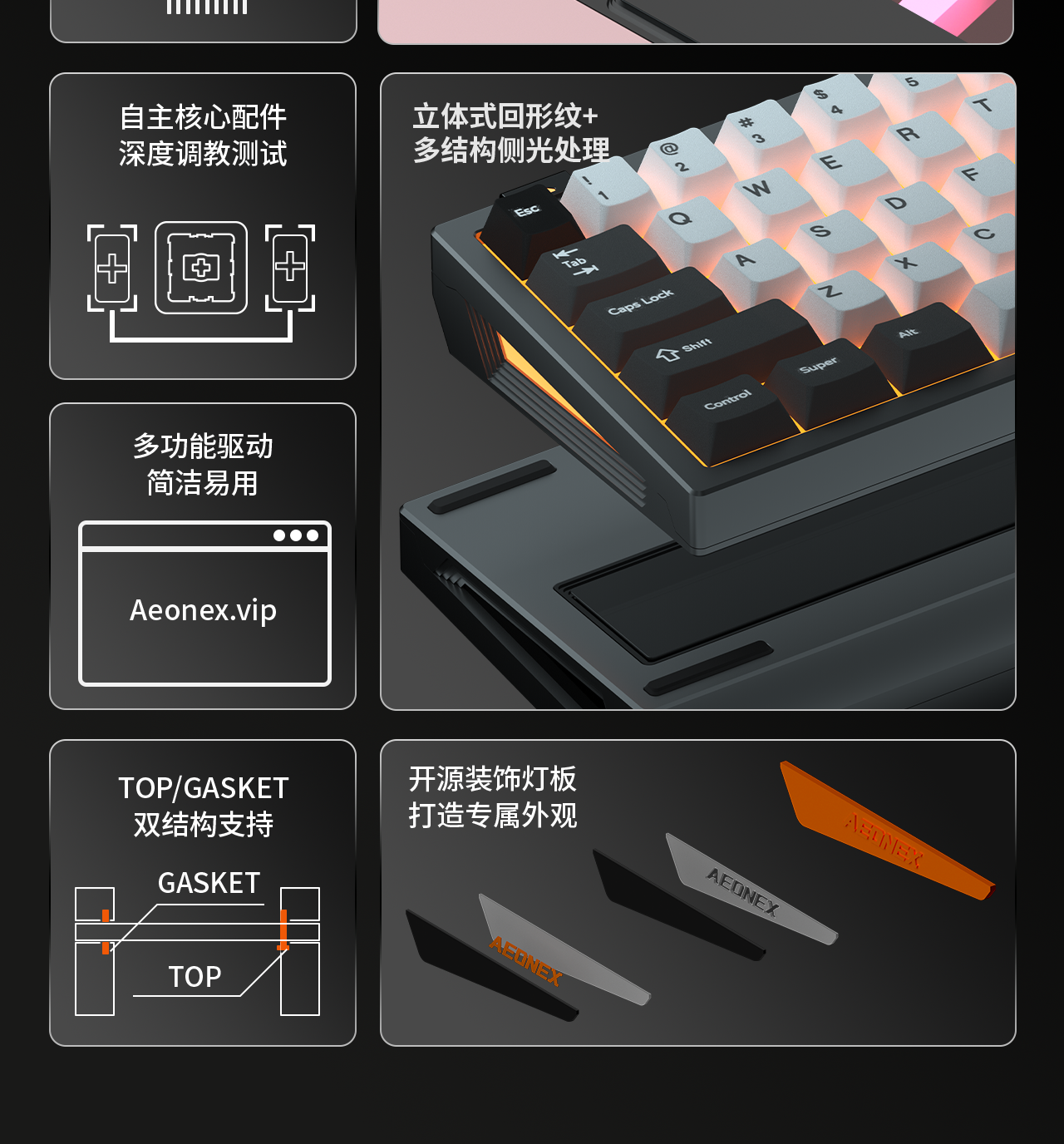 首创原生RT,ASA算法系统,多功能驱动简洁易用,化繁为简,操作快人一步。TOP/GASKET双结构支持,TOP结构敲击反馈清晰、结构扎实、性能稳定。GASKET结构较为柔软的敲击体验,可根据个人手感需求自由调整。严格的工艺把控:220目阳极氧化/静电粉末喷涂;CNC与镜面PVD等多道工艺共同打造,整机外壳无压铸,无金属板薄板拼接,质感细腻,稳固耐用;1600W色幻彩灯光系统,立体式回形纹和多结构侧光处理,全域灯光同步;自主核心配件,经过深度调教测试,键盘核心轴体与卫星轴均采用自主模具生产,从源头实现对配件品质的把控,规避第三方配件的性能偏差问题。
