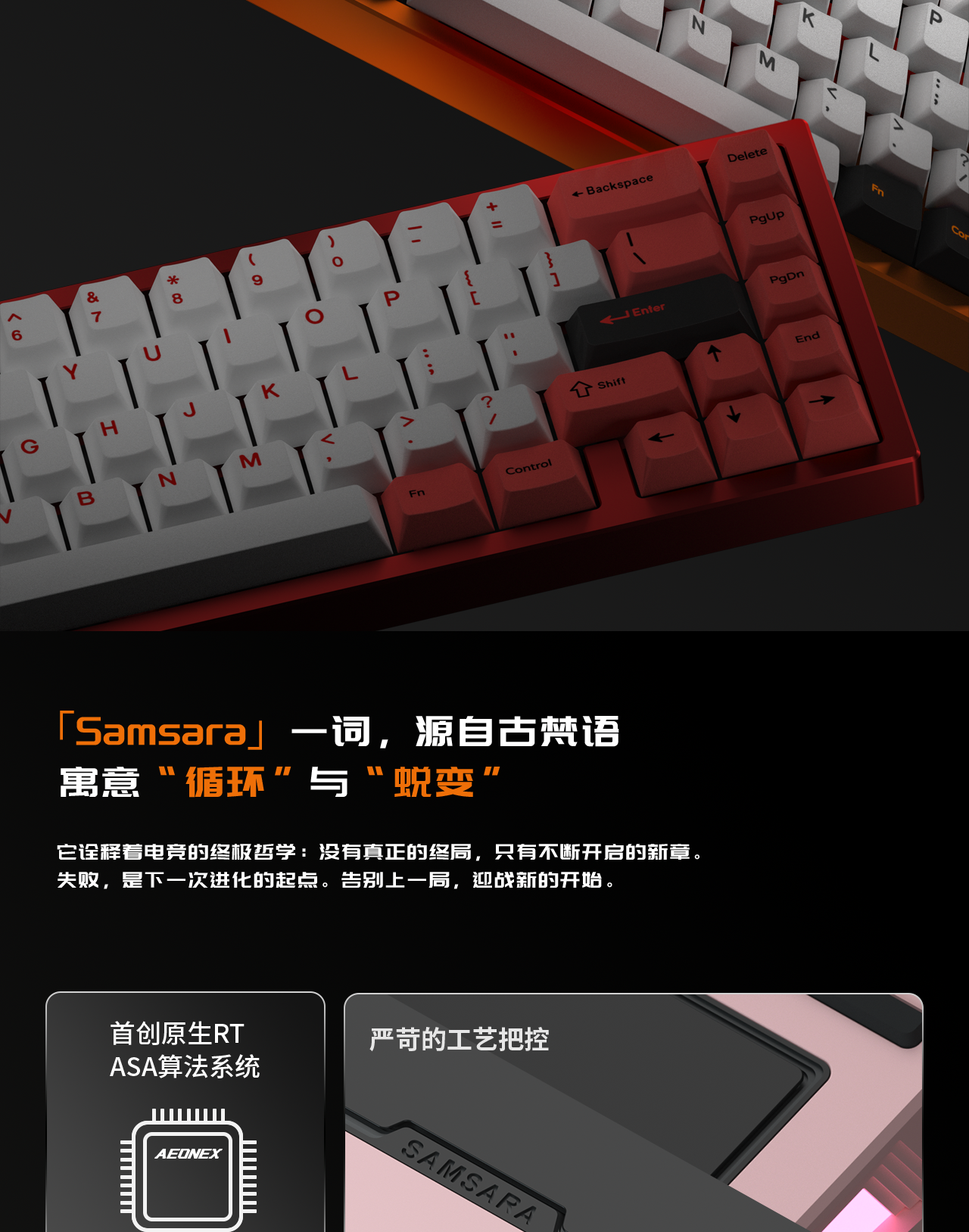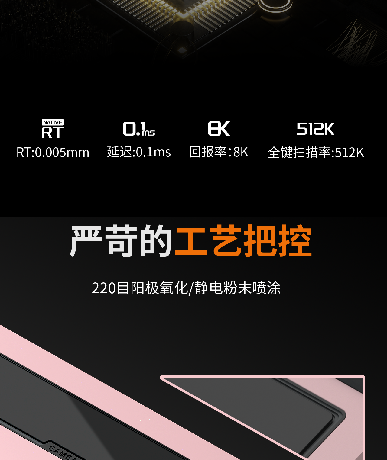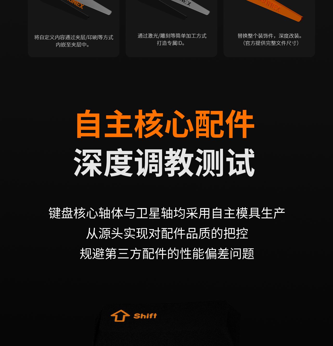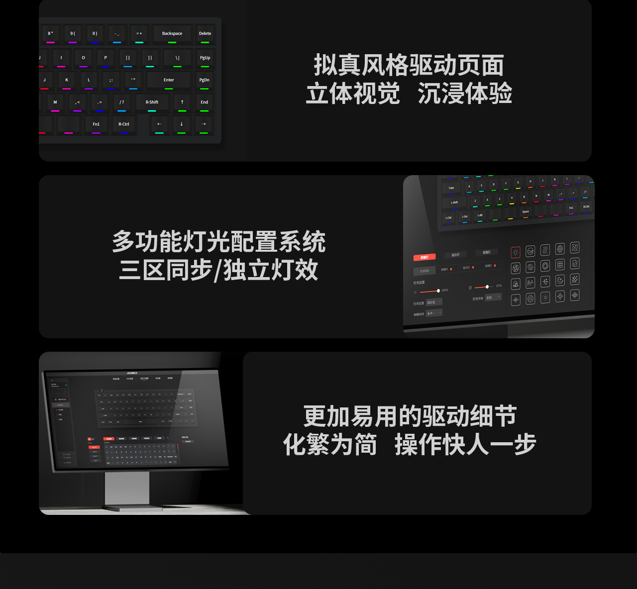 首创原生RT,ASA算法系统,多功能驱动简洁易用,化繁为简,操作快人一步。TOP/GASKET双结构支持,TOP结构敲击反馈清晰、结构扎实、性能稳定。GASKET结构较为柔软的敲击体验,可根据个人手感需求自由调整。严格的工艺把控:220目阳极氧化/静电粉末喷涂;CNC与镜面PVD等多道工艺共同打造,整机外壳无压铸,无金属板薄板拼接,质感细腻,稳固耐用;1600W色幻彩灯光系统,立体式回形纹和多结构侧光处理,全域灯光同步;自主核心配件,经过深度调教测试,键盘核心轴体与卫星轴均采用自主模具生产,从源头实现对配件品质的把控,规避第三方配件的性能偏差问题。