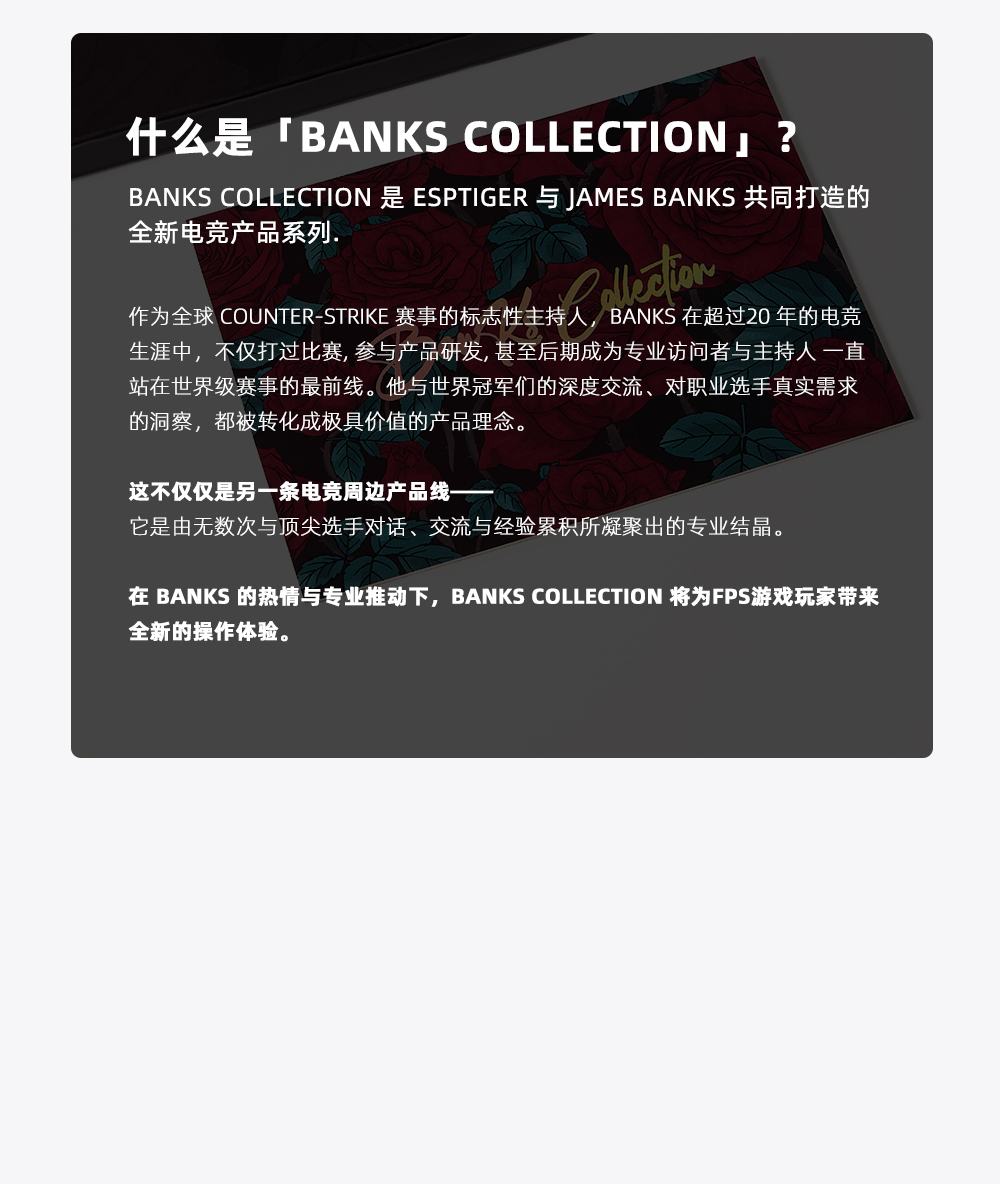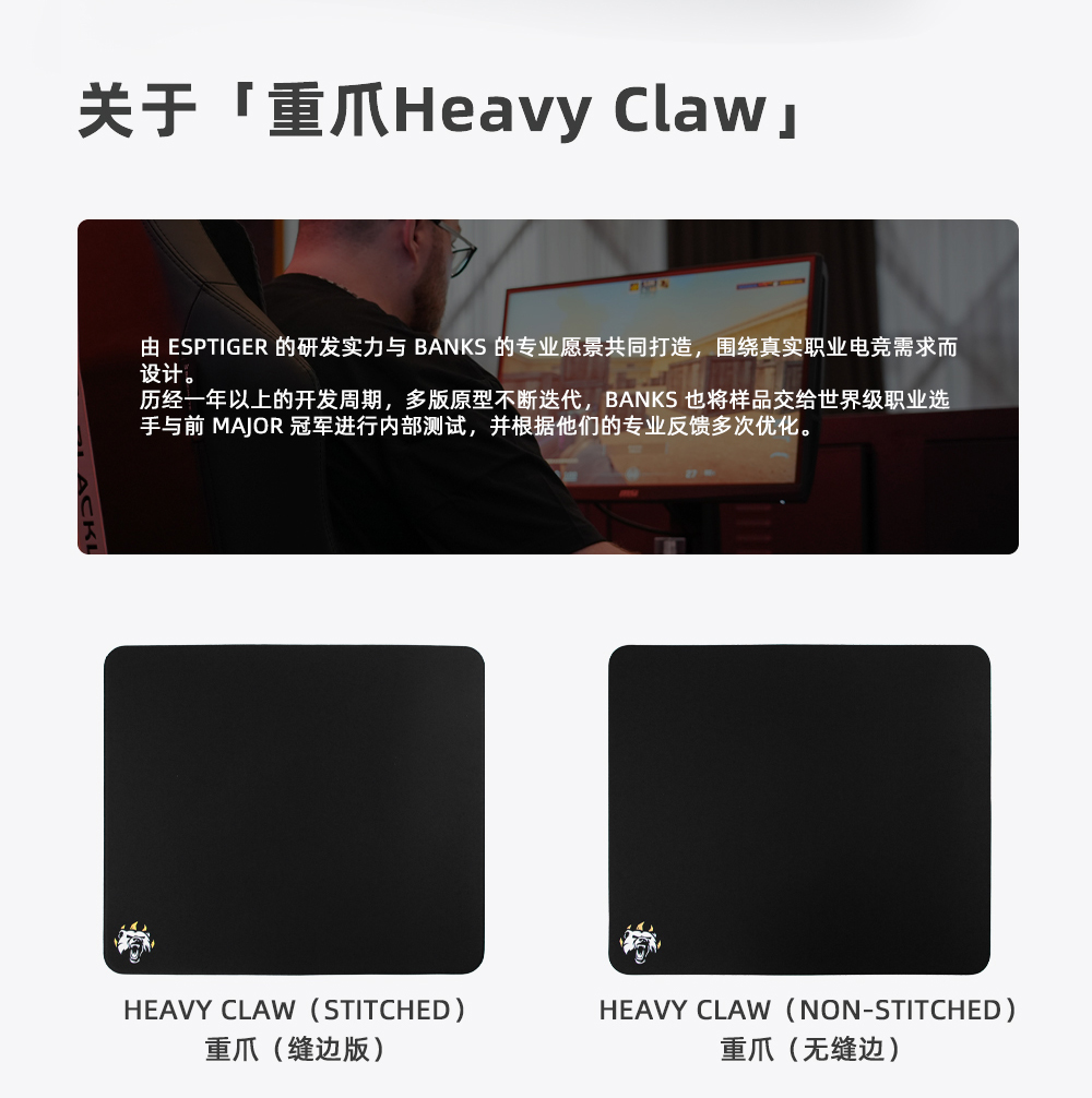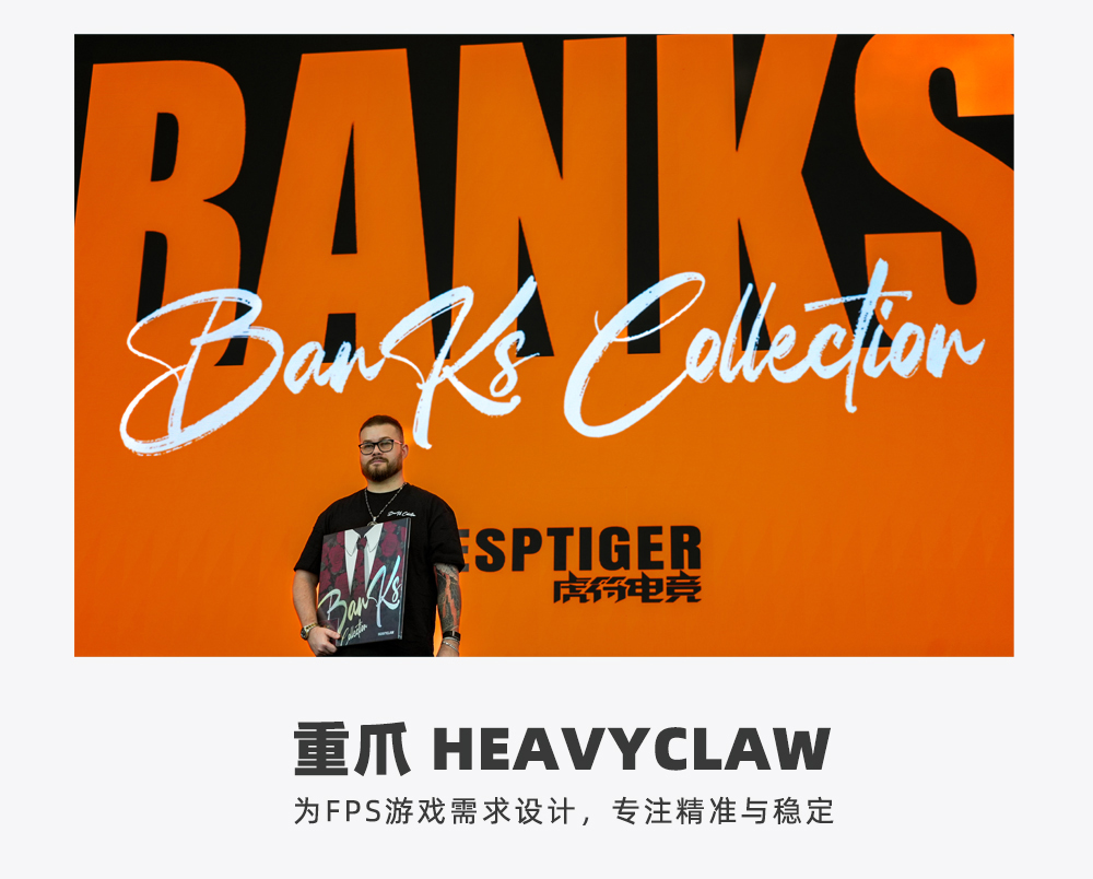 由 ESPTIGER 的研发实力与 BANKS 的专业愿景共同打造,围绕真实职业电竞需求而设计。历经一年以上的开发周期,多版原型不断选代,BANKS 也将样品交给世界级职业选手与前 MAJOR 冠军进行内部测试,并根据他们的专业反馈多次优化。