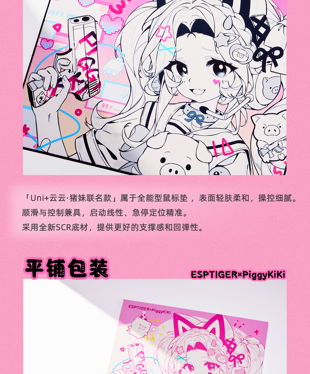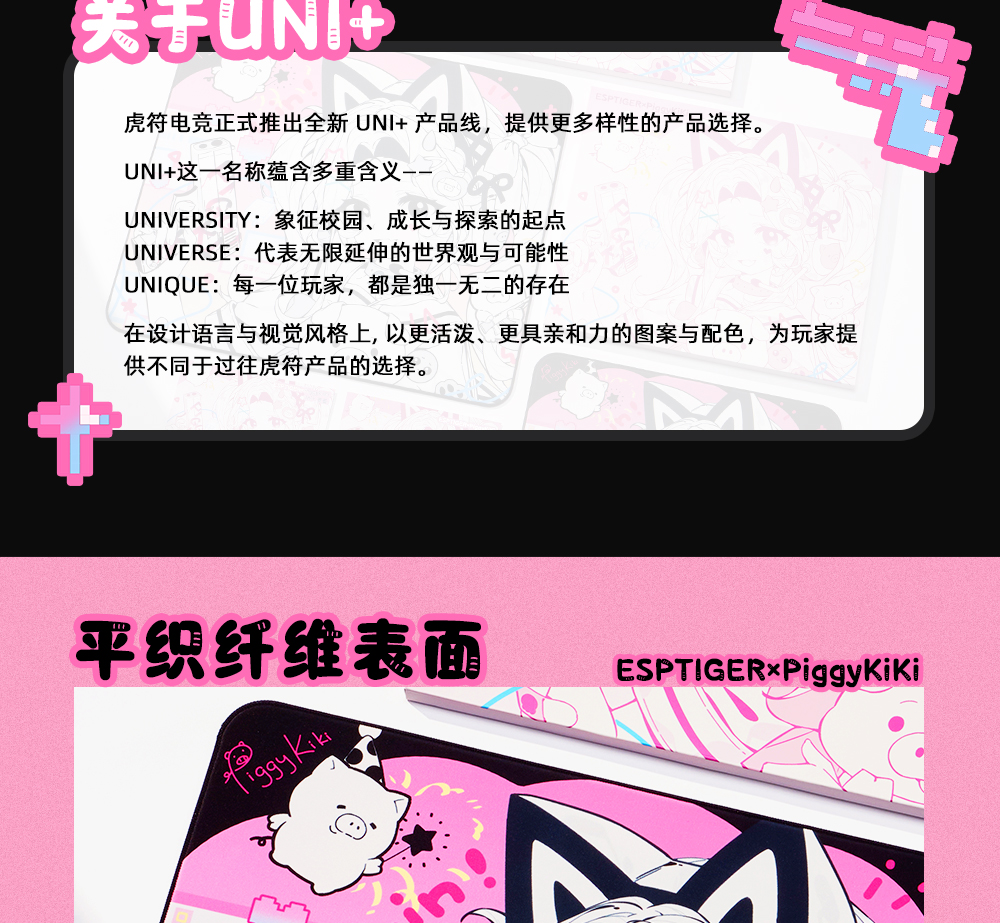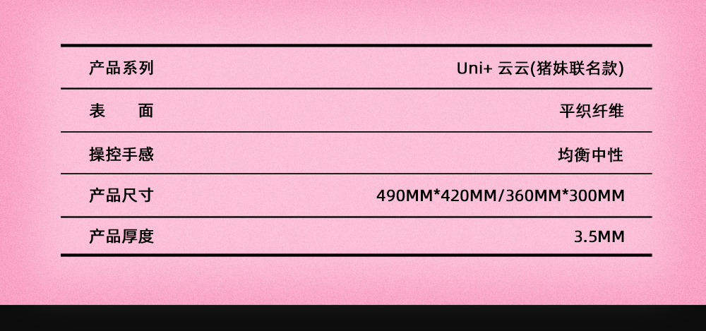 本次UNI+系列特别推出虎符电竞与COUNTER-STRIKE 反恐精英前职业选手猪妹PIGGYKIKI共同打造的联名合作款--「Uni+云云」,本次联名以职业选手的实际使用需求为出发点,结合猪妹PIGGYKIKI对电竞外设的设计想法,在底胶软硬度与布面纹理设计上进行针对性优化,呈现出一款兼具竞技性能与个性表达的联名产品。「Unit云云·猪妹联名款」属于全能型鼠标垫,表面轻肤柔和,操控细腻。顺滑与控制兼具,启动线性、急停定位精准。采用全新SCR底材,提供更好的支撑感和回弹性。
